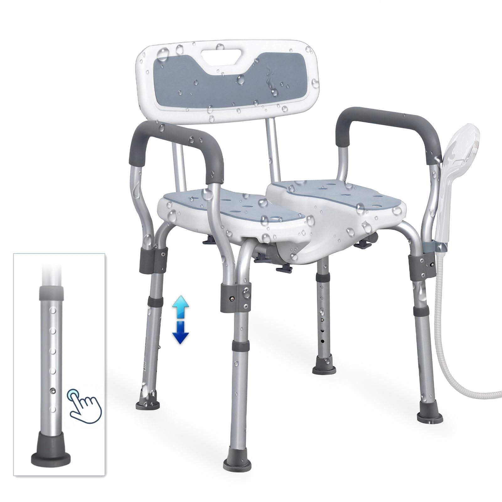 - ComfortableShower chair for seniors for shower stall with cutout cushion, removable padded seat back and assist grip arm rests for additional support and comfort. Handicap shower chair with arms to meet different occasions, such as hospitals, nursing homes, bathrooms, public places, etc.