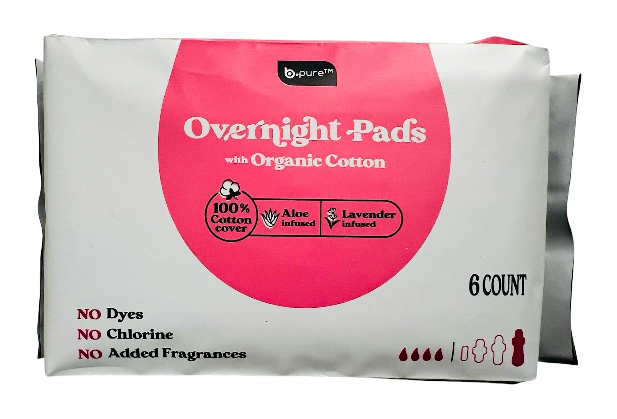 B-Pure Overnight Pads are made with 100% organic cotton. Infused with Aloe Vera and Lavender, B-Pure pads contain no dyes and no chlorine, leaving you feeling fresh and protected.
