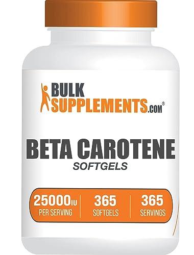 Beta Carotene Softgels by BulkSupplements.com are converted into Vitamin A in the body, which is an essential vitamin for overall wellness.* Each serving of this product is 1 softgel per day, and each softgel of this vitamin supplement contains 7500 mcg, or 25000 IU, of Beta Carotene. These Beta Carotene Softgels, or Beta Carotene pills, are sold in 365 Count stored and packaged in bottles, where it contains a 365 days, or 1 year supply. Our Beta Carotene 25000 IU Softgels, or Vitamin A supplement, is gluten free, dairy free and yeast free. Our Beta Carotene supplements contains soy, and should not be consumed by anyone with senstivities to soy products. All products by BulkSupplements.com are manufactured according to cGMP Standards to ensure the highest quality for manufacturing, packaging, labeling, and holding operations. We work with a third-party laboratory to test our products at multiple stages during production, from raw material to finished products, and ensures compliance, standards, and consistency.
