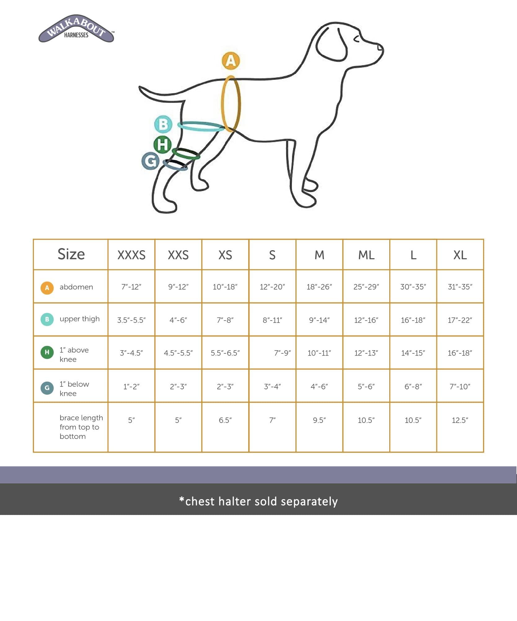 The Walkabout knee brace is a 3.0 mm neoprene compression sleeve that is designed to support and stabilize the knee joint. This product offers excellent support for knee joint injuries, luxating patella or severe arthritis due to old age or chronic instability. The knee brace comes with a suspender which can attach to a chest halter. A chest halter is not included with this purchase but it is recommended to be used in combination with the Walkabout Knee brace. Fit is determined by measuring the leg and following the size charts. Try to measure as straight a leg as possible. If the injured side is swollen please measure the uninjured side to get an accurate measurement. The fit is usually determined by evaluating the measurements 1" above the knee. If the other measurements do not fit in that size category please email us your dogs breed, weight and measurements to help choose the best size. Notice: PLEASE MEASURE CAREFULLY 1" ABOVE THE KNEE FOR THE RIGHT FIT, PLEASE DO NOT SIZE DOWN WITHOUT CONTACTING US FIRST.
