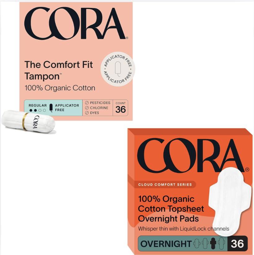 Cora Organic Feminine Care | Non-Applicator Ultra-Absorbent Tampons & Ultra Thin Organic Pads | Overnight Absorbency | 100% Organic Cotton | Eco-Conscious | 36 Tampons & Pads
