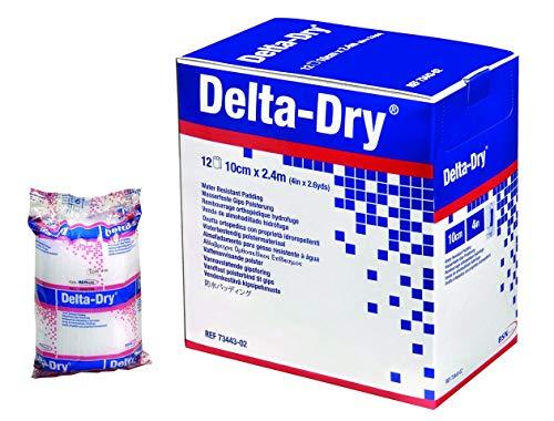 Cast Padding Water Resistant Delta-Dry 2 Inch X 2.6 Yard Synthetic NonSterile. Brand: Delta-Dry. Manufacturer Name: BSN Medical. Manufacturer Number: 7344300. Application: Cast Padding. Color: White. Dimensions: 2 Inch X 2.6 Yard. Material: Synthetic. Sterility: NonSterile. Type: Water Resistant. SOLD BY: Pack of 12. Delta-Dry features an unique patented technology that out performs other water resistant cast padding Delta-Dry is water resistant, in contrast to waterproof cast padding, it is penetrable by water therefore allowing moisture to move through which reduces the risk of skin macerations The open knit structure, along with the water resistant qualities of the fibers, allow water to quickly drain from the cast Allows patients to shower, swim and bathe when wearing a cast The patented 3D knit structure of the water resistant cast padding is extremely stretchable and conformable Wrinkle-free application is easily achievable without the need to learn a special application technique