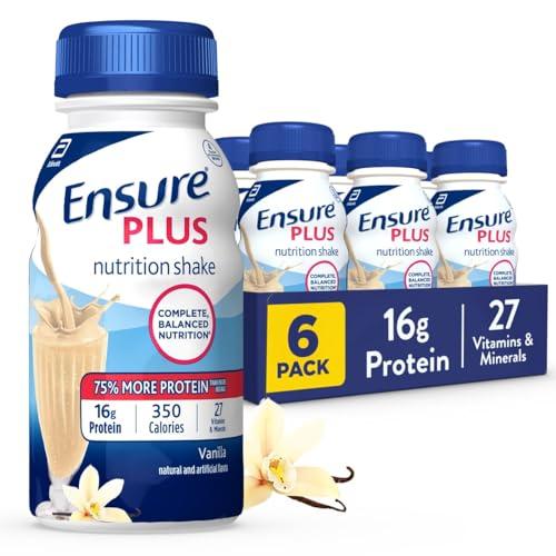 Ensure Plus nutrition shakes are clinically proven to help gain weight. Each shake contains 16 grams of high-quality protein, 350 calories, 27 vitamins and minerals, and nutrients to support immune-system health, including vitamins A and D, zinc, and antioxidants.* Ensure Plus protein shakes provide complete, balanced nutrition and are a great meal replacement option! * Vitamins C and E. Ensure Plus = 16 g protein per 8 fl oz vs Ensure Original = 9 g protein per 8 fl oz.