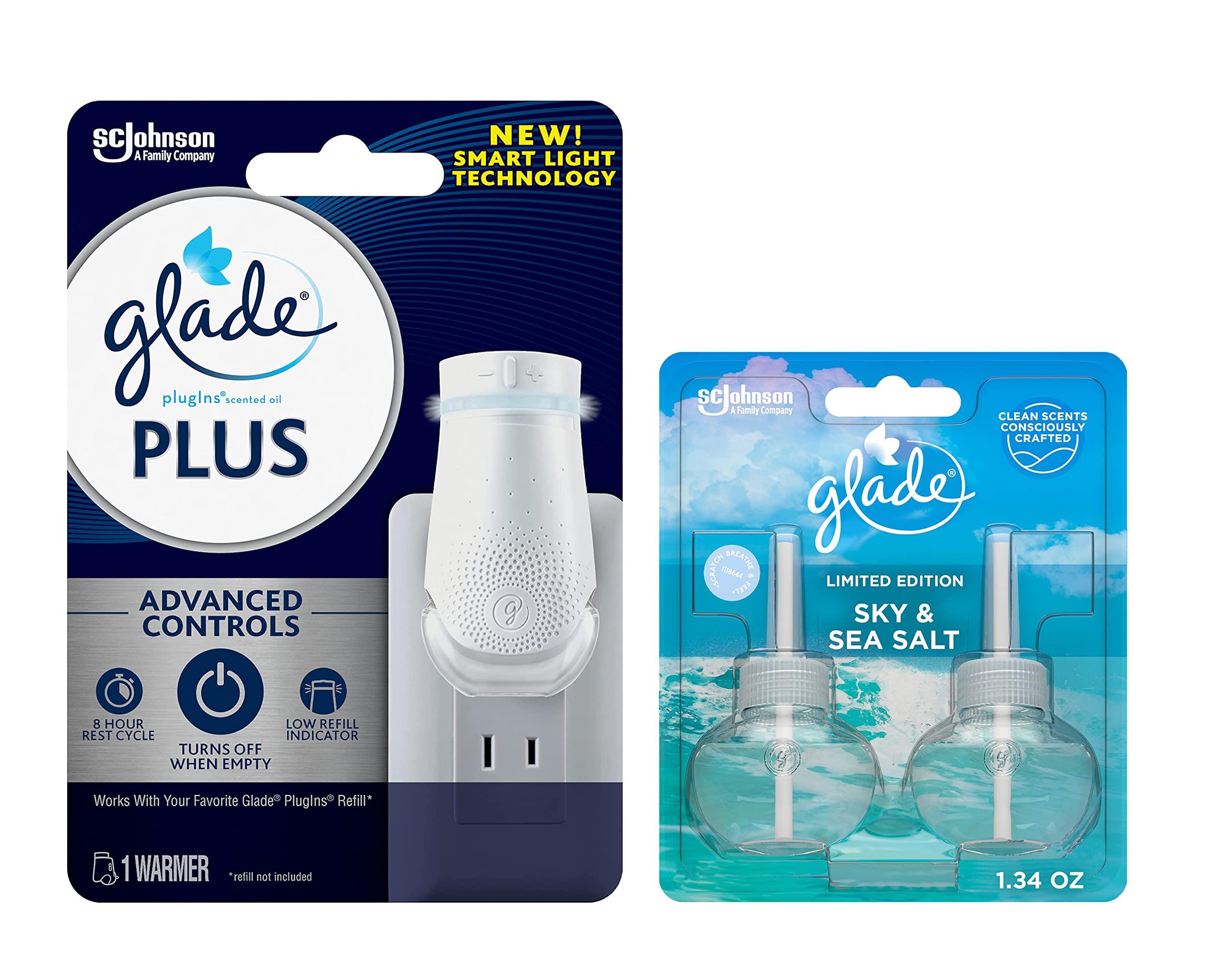 Glade PlugIn Plus Air Freshener Starter Kit, Scented Oil for Home and Bathroom, 1 Warmer + Refills (Warmer & 2 Sky & Sea Salt)