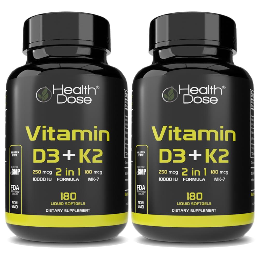 Health Dose Health Dose Vitamin D3 10,000 IU + K2 (MK7) Supplement, 2-in-1 Formula, Immune Support, a Healthy Mood, Heart, Joint, Teeth, Bone Health, Calcium Absorption, 180 softgels. (2)