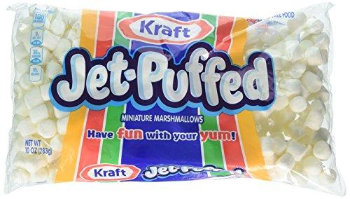 Jet-Puffed Miniature Marshmallows are a delicious and versatile dessert topping. These bite sized mini marshmallows deliver the sweet taste and fluffy texture you know and love. With zero grams of fat per serving, mini marshmallow bits make a fun snack for kids or a mouthwatering addition to your favorite dessert recipes. Miniature marshmallows are great as toppings in hot chocolate or as a sweet potato casserole topping. They also are perfect for recipes such as rice cereal treats, frostings, and snack mixes. Miniature marshmallows come packaged in a sealed 10 ounce bag for lasting freshness until you're ready to enjoy.