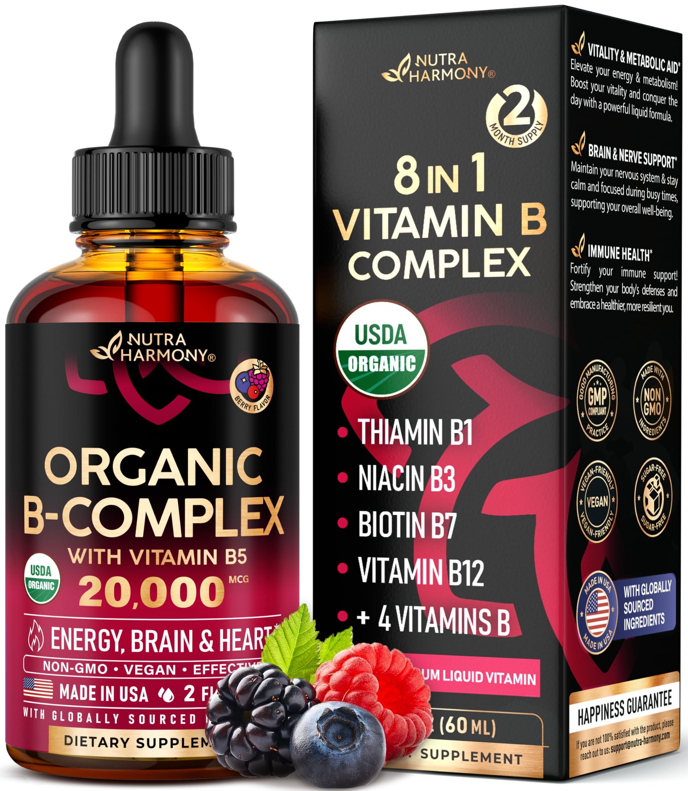 - USDA Organic Vitamin B Complex Empower energized & vibrant you with our premium quality USDA-organic liquid b complex drops with vitamin B5 & Methylcobalamin B12. Organic vitamin b complex B1, B2, B3, B4, B5, B6, B7, B9 & B12 are designed to supercharge energy levels, this liquid powerhouse is a go-to source for feeling more alive and vibrant daily.