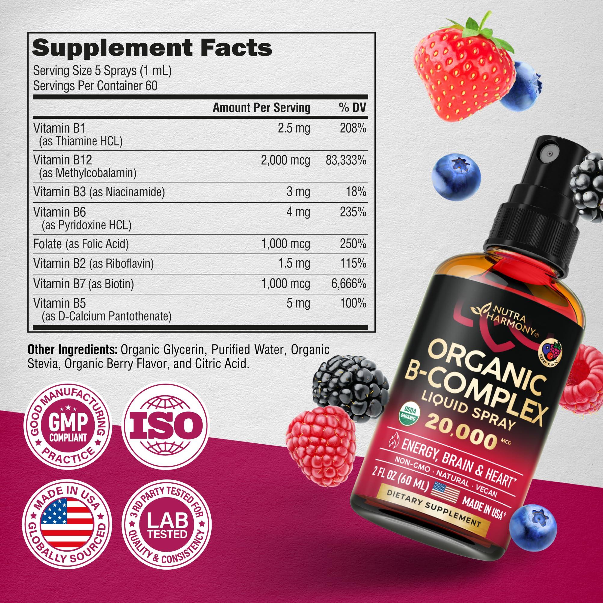 - USA-made, Organic & Safe USDA organic liquid vit b complex formula signifies a potent dosage, ensuring each spray is robust and has maximum benefits for your wellness. Vitamin b spray are non-GMO, alcohol-free, and free of DYE or preservatives. Organic B-complex spray has been meticulously crafted per the most rigorous industry standards, utilizing cutting-edge state-of-the-art manufacturing processes to ensure exceptional quality outcomes.
